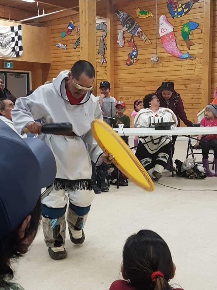 Ernie Eetak is a well known inuk drum dancer and has been performing as a drum dancer since 1992. He is from Arviat and has been living in Arviat Nunavut since birth. In his childhood, he would go with his grandmother and mother to a gathering place of igloos for drum dancing and singing pihiqs (Inuit songs). He has performed at many different events and places over the years including: Resolute Bay Nunavut, Whitehorse, Yukon, Ottawa, Ontario, the new Government of Nunavut building, the Inumariit Music Festival and was a part of the opening ceremony at the New Hamlet of Arviat Building. He was a member of the ‘Arviat Qaggitiit’ group, which is a collection of artists who perform to Tourists in Arviat. They performed for the former Governor General, David Johnston. Ernie Eetak speaks two languages: Inuktitut and English.