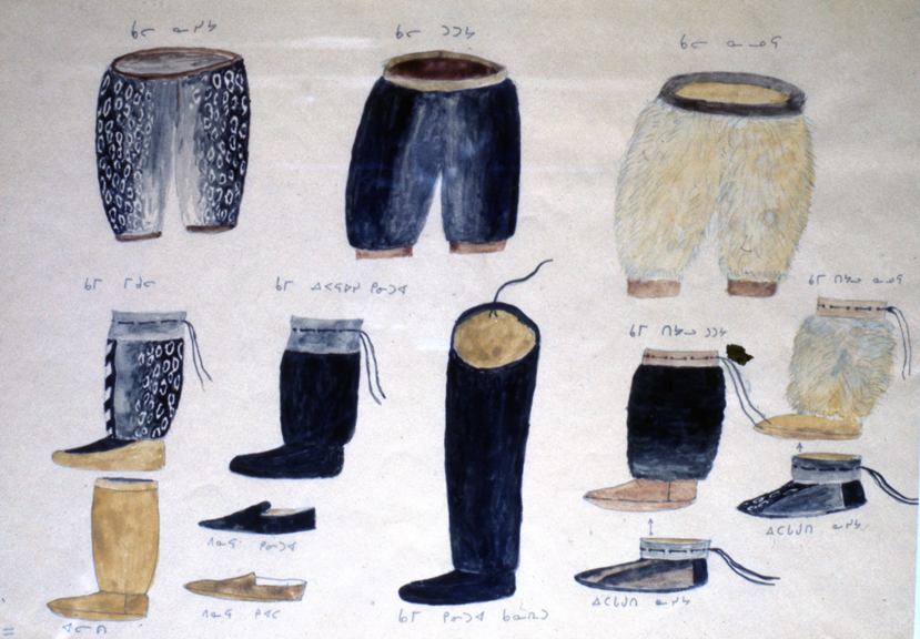 Drawing of 3 caribou pants and of 10 caribou boots and mocassins. 1971Photograph of watercolour drawing by Isa Smiler (Inukjuak) of caribou clothingBernard Saladin d'Anglure Bernard Saladin d'Anglure fonds/Avataq Cultural Institute/BSA-182See more